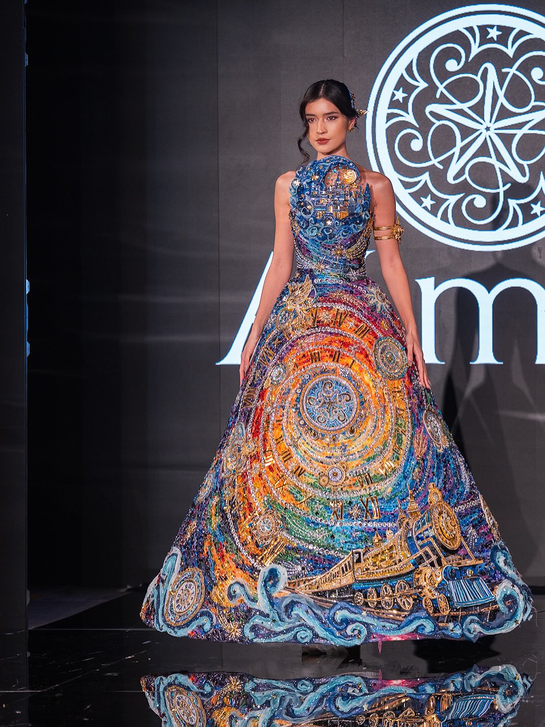 From mini dresses to caped floor length gowns, this variety in style was bound to have at least one piece that appealed to each member of the audience. However, there was one piece that made a distinct impression. Model Mélia Constantin was ordained in a 28 kilogram dress. The gown, fittingly named ‘Time Voyage’, was intricately embellished with beads and crystals, taking the audience on a journey through time with one impeccable silhouette.